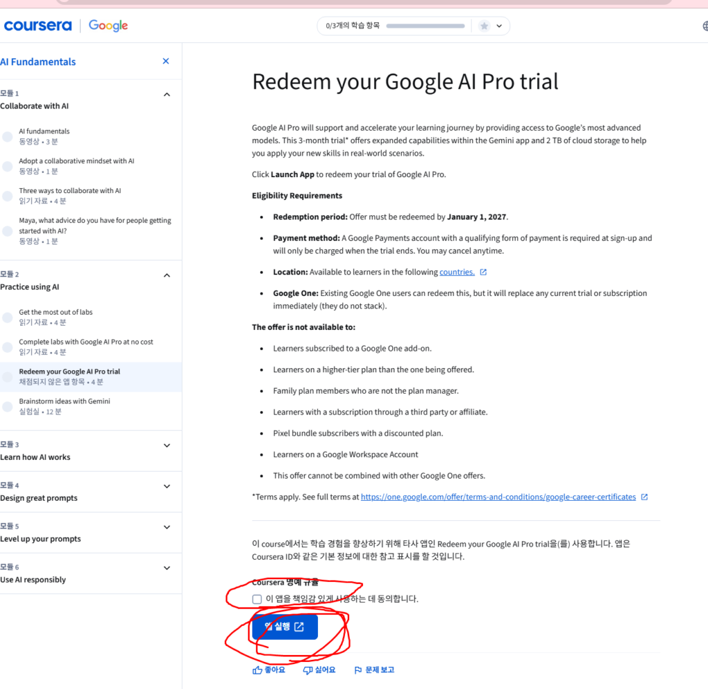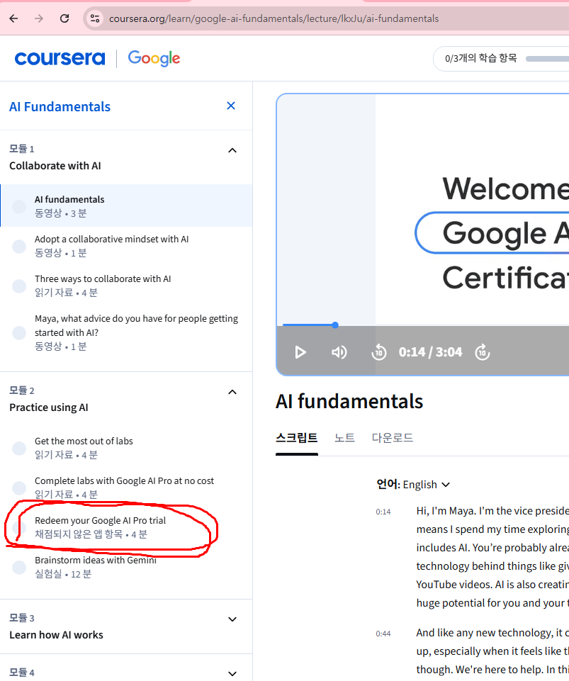 왼쪽 강좌 메뉴에서 Redeem your Google Ai Pro trial 클릭