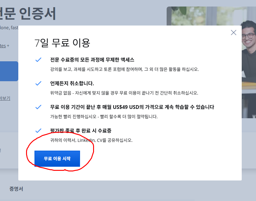 무료 체험 시작 화면에서 결제 예정일/요금 재확인