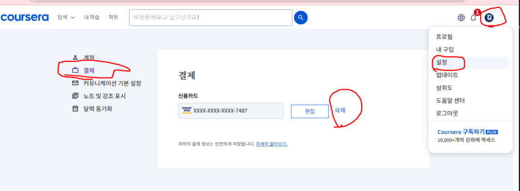 프로필 클릭 후 결제 페이지에서 카드 삭제 : https://www.coursera.org/account-settings