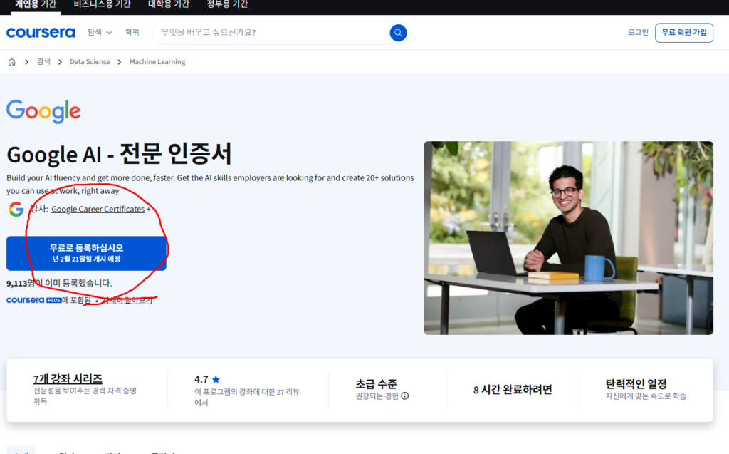 프로모션 페이지 ==>> https://www.coursera.org/google-certificates/google-ai