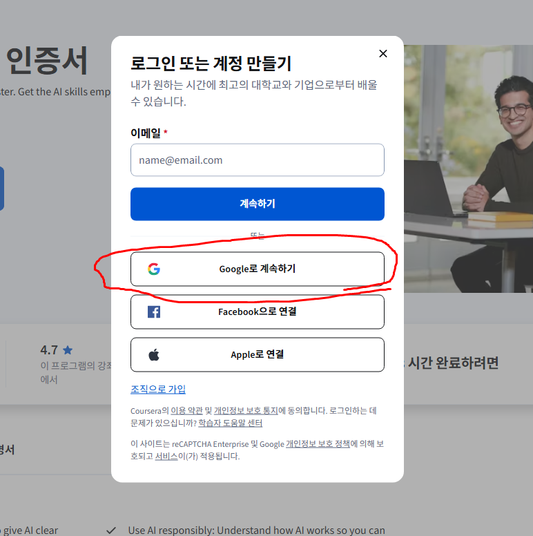 코세라 계정으로 등록(또는 기존 계정 로그인)